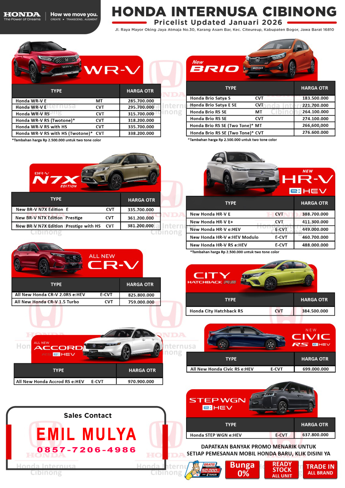 - Harga yang tertera adalah harga mobil Honda untuk wilayah Bogor dan sekitarnya,